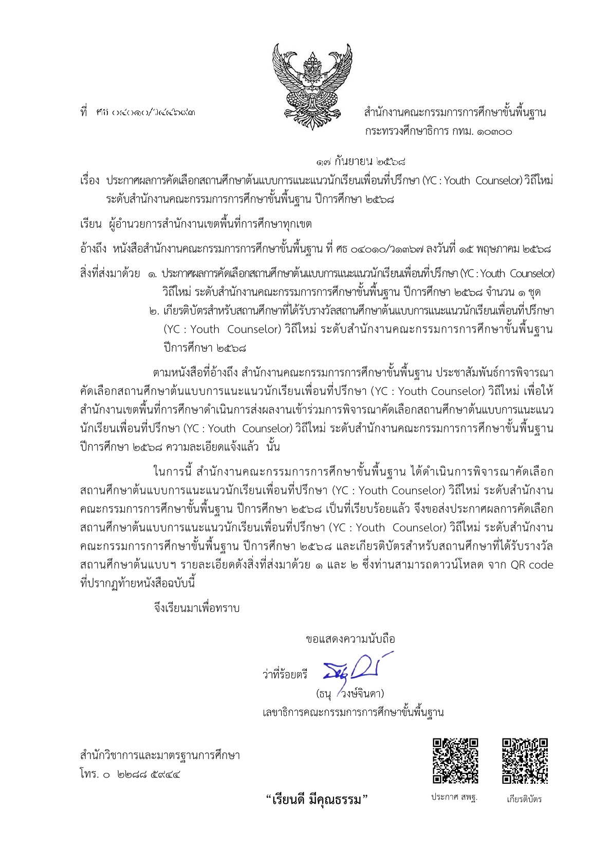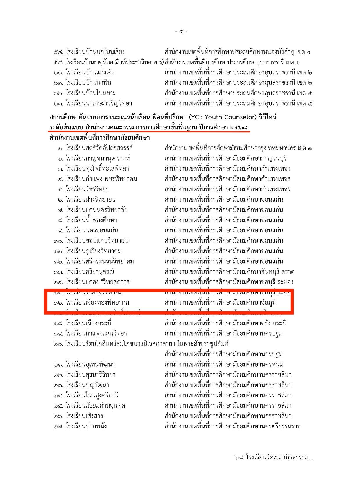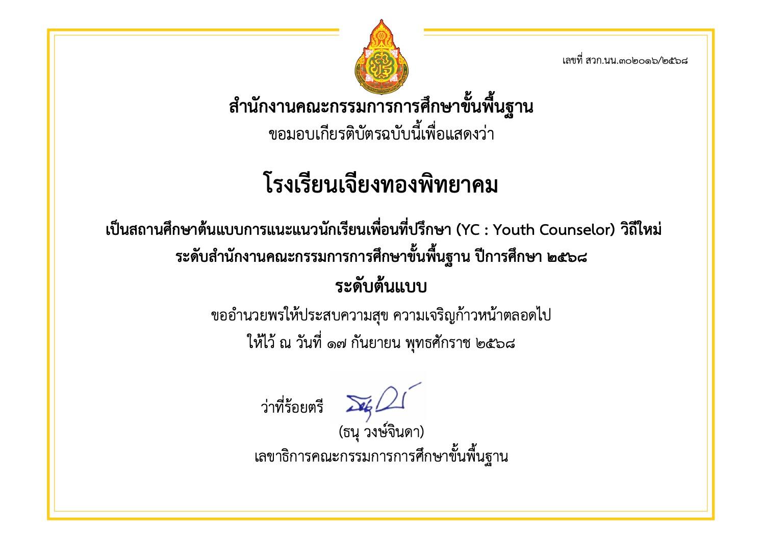 โรงเรียนเจียงทองพิทยาคม ได้รับการคัดเลือกเป็นสถานศึกษาต้นแบบการแนะแนวนักเรียนเพื่อนที่ปรึกษา (YC : Youth Counselor) วิถีใหม่ ระดับสำนักงานคณะกรรมการการศึกษาขั้นพื้นฐาน ปีการศึกษา 2568 ระดับต้นแบบ