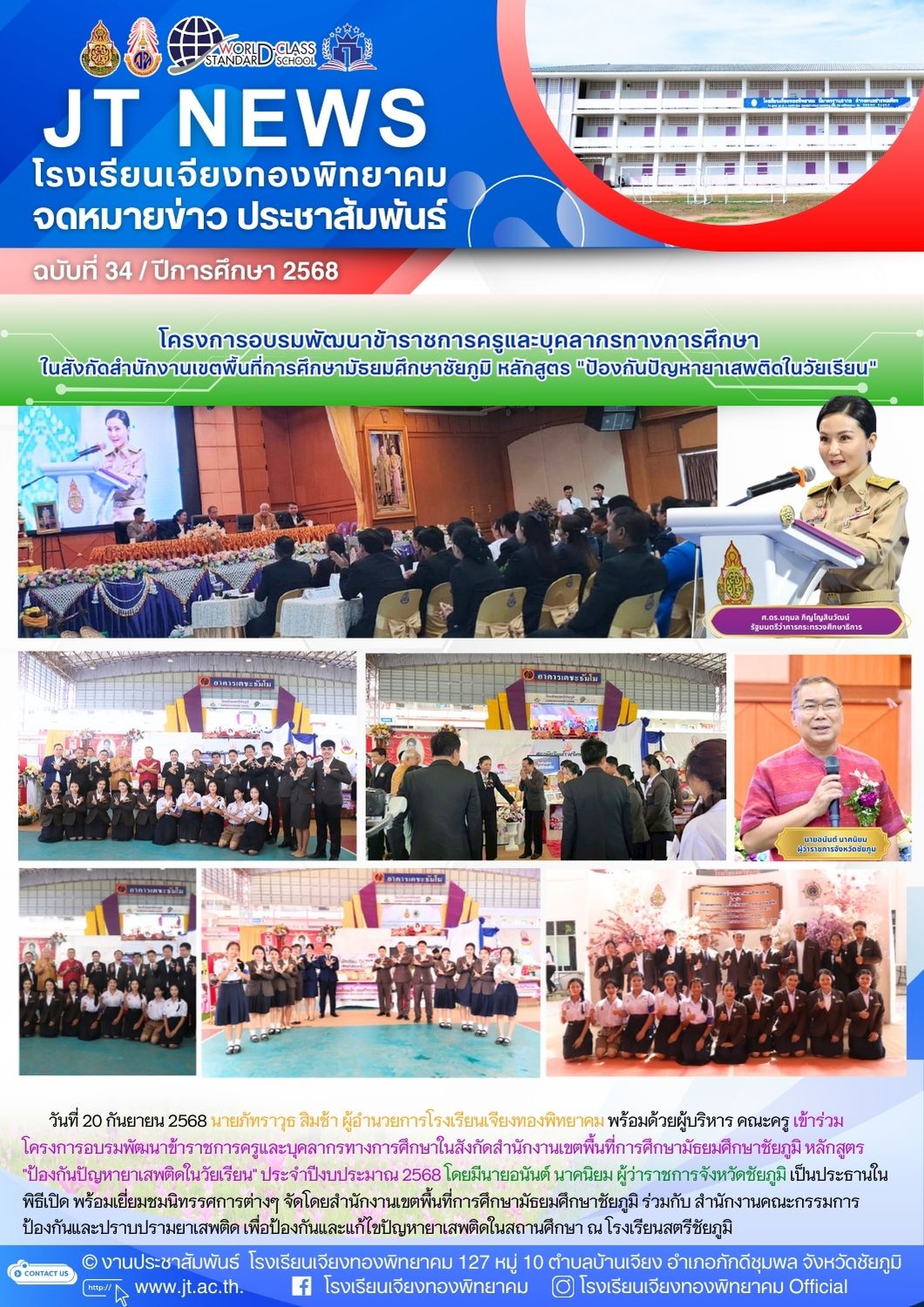 วันที่ 20 กันยายน 2568 นายภัทราวุธ สิมช้า ผู้อำนวยการโรงเรียนเจียงทองพิทยาคม พร้อมด้วยผู้บริหารและคณะครู เข้าร่วมโครงการอบรมพัฒนาข้าราชการครูและบุคลากรทางการศึกษาในสังกัดสำนักงานเขตพื้นที่การศึกษามัธยมศึกษาชัยภูมิ หลักสูตร "ป้องกันปัญหายาเสพติดในวัยเรียน" ประจำปีงบประมาณ 2568 โดยมีนายอนันต์ นาคนิยม ผู้ว่าราชการจังหวัดชัยภูมิ เป็นประธานในพิธีเปิด พร้อมเยี่ยมชมนิทรรศการต่างๆ จัดโดยสำนักงานเขตพื้นที่การศึกษามัธยมศึกษาชัยภูมิ ร่วมกับ สำนักงานคณะกรรมการป้องกันและปราบปรามยาเสพติด เพื่อป้องกันและแก้ไขปัญหายาเสพติดในสถานศึกษา ณ โรงเรียนสตรีชัยภูมิ