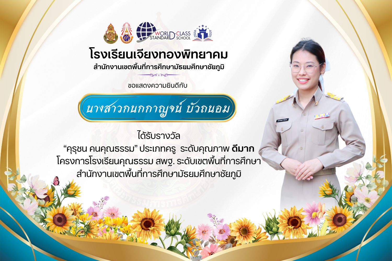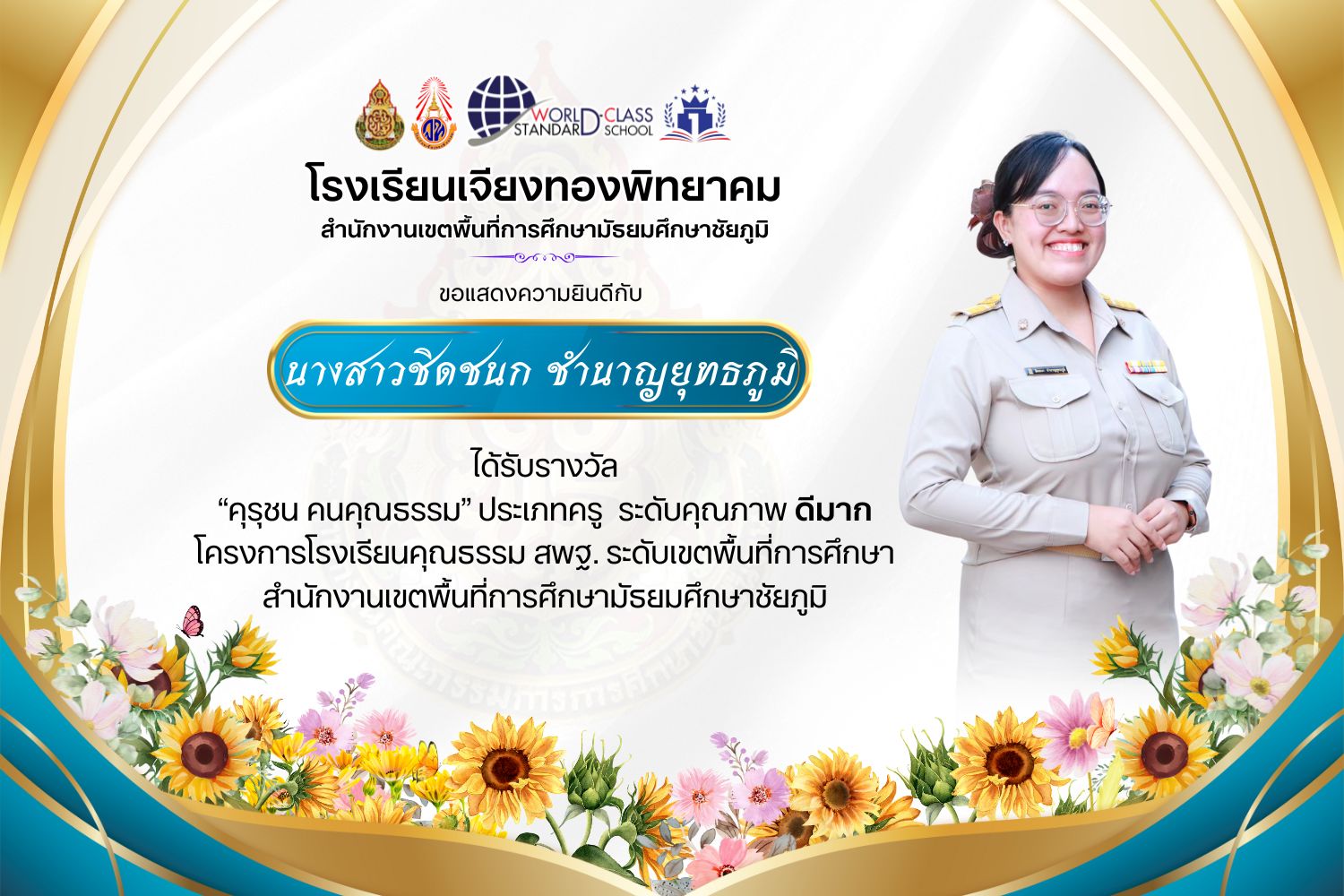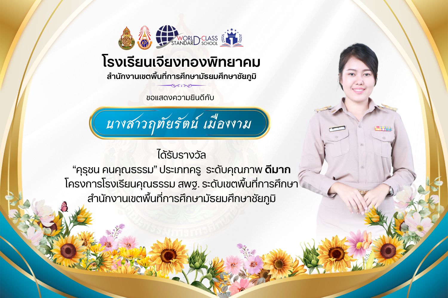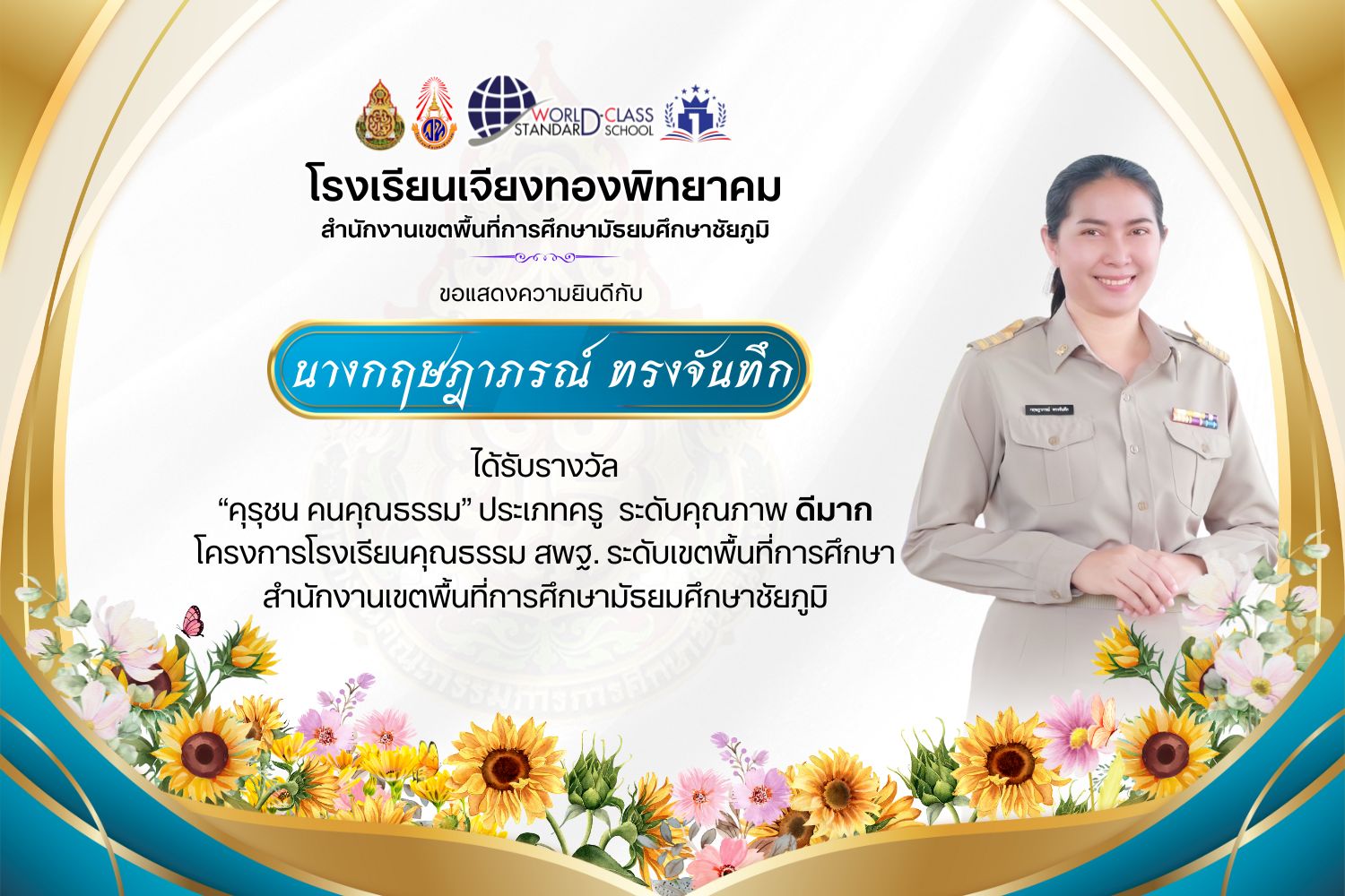 โรงเรียนเจียงทองพิทยาคม ขอแสดงความยินดีกับคณะครู ที่ได้รับรางวัล“คุรุชน คนคุณธรรม” ประเภทครู ระดับคุณภาพ ดีเยี่ยมและดีมาก โครงการโรงเรียนคุณธรรม สพฐ. ระดับเขตพื้นที่การศึกษา สำนักงานเขตพื้นที่การศึกษามัธยมศึกษาชัยภูมิ