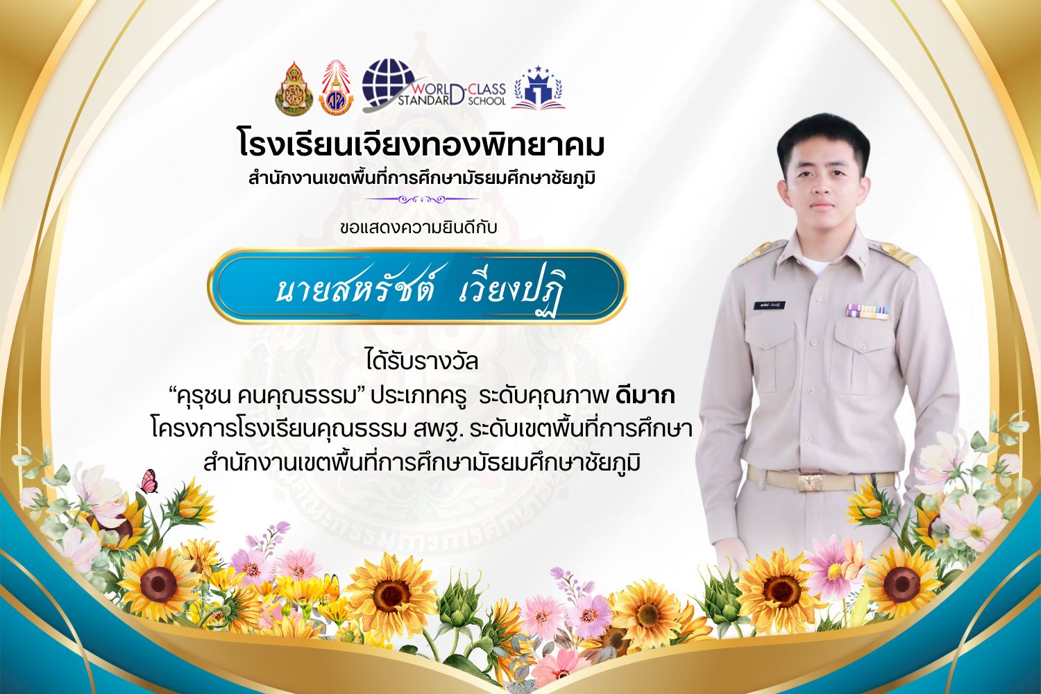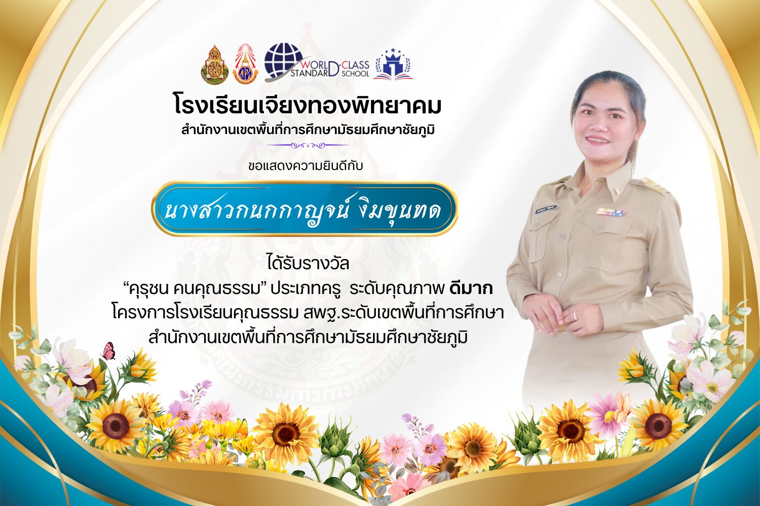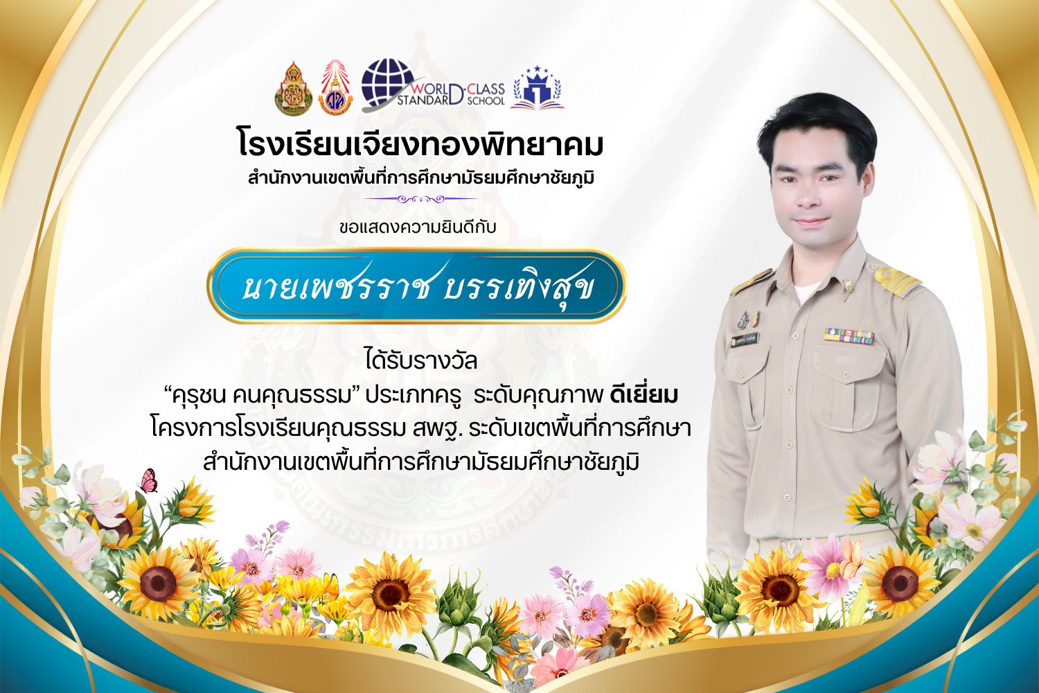 โรงเรียนเจียงทองพิทยาคม ขอแสดงความยินดีกับคณะครู ที่ได้รับรางวัล“คุรุชน คนคุณธรรม” ประเภทครู ระดับคุณภาพ ดีเยี่ยมและดีมาก โครงการโรงเรียนคุณธรรม สพฐ. ระดับเขตพื้นที่การศึกษา สำนักงานเขตพื้นที่การศึกษามัธยมศึกษาชัยภูมิ