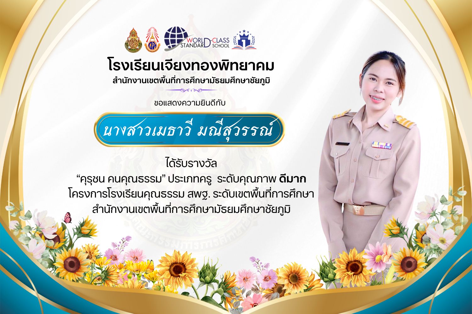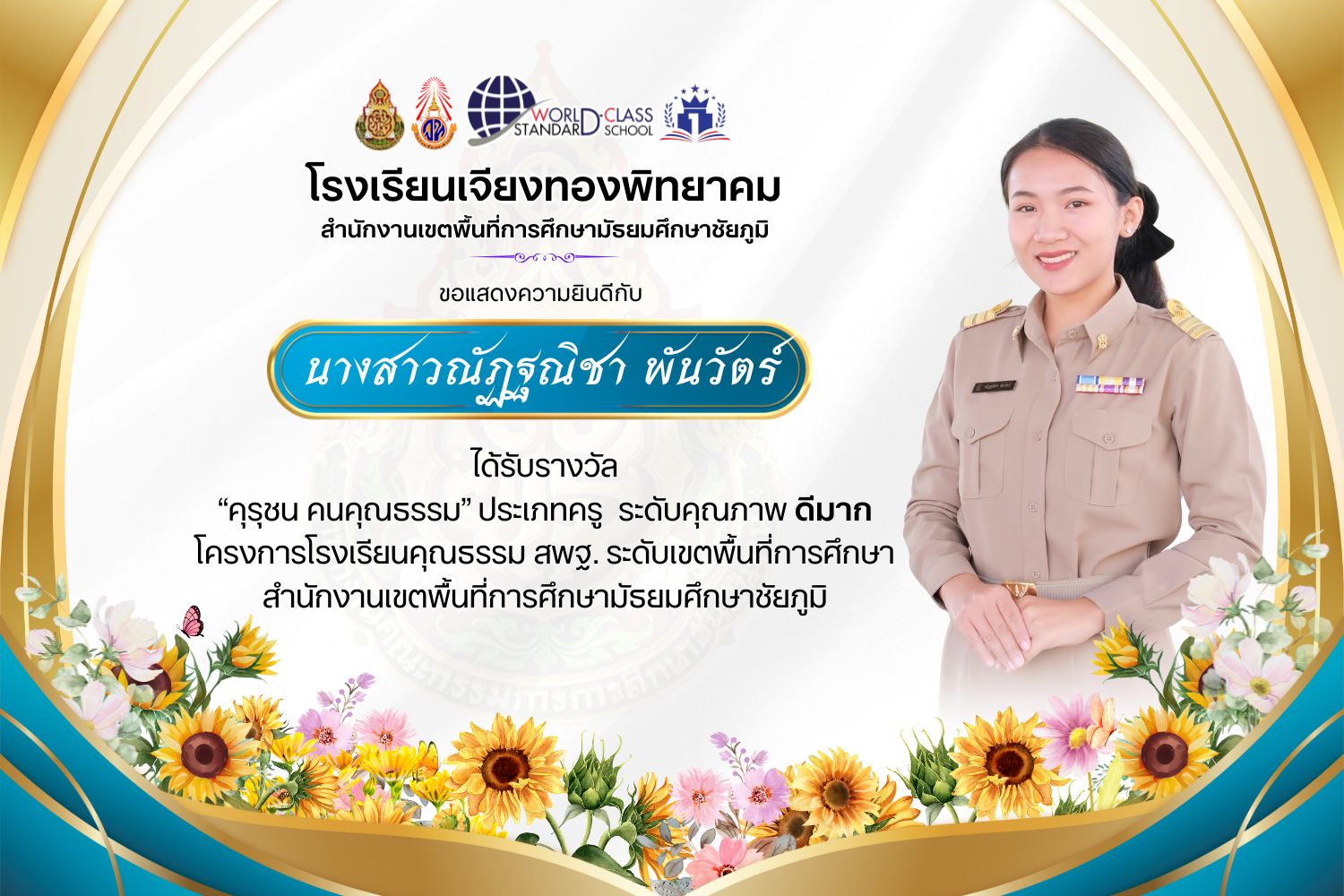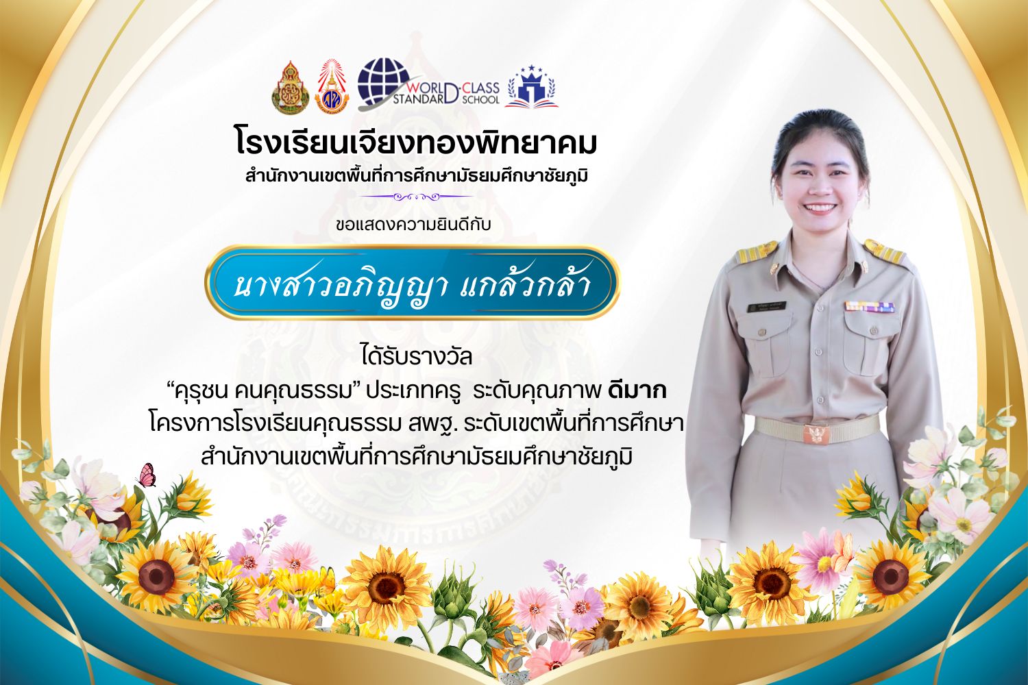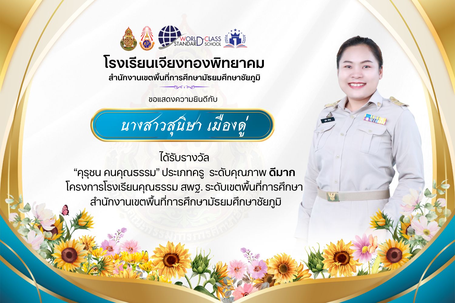 โรงเรียนเจียงทองพิทยาคม ขอแสดงความยินดีกับคณะครู ที่ได้รับรางวัล“คุรุชน คนคุณธรรม” ประเภทครู ระดับคุณภาพ ดีเยี่ยมและดีมาก โครงการโรงเรียนคุณธรรม สพฐ. ระดับเขตพื้นที่การศึกษา สำนักงานเขตพื้นที่การศึกษามัธยมศึกษาชัยภูมิ