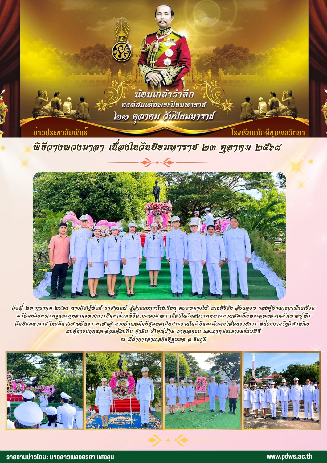 วันที่ ๒๓ ตุลาคม ๒๕๖๘ นายวิชญ์พันธ์ ราชานนท์ ผู้อำนวยการโรงเรียน มอบหมายให้ นายศิริชัย อ้อนอุบล รองผู้อำนวยการโรงเรียน พร้อมด้วยคณะครูและบุคลากรทางการศึกษาร่วมพิธีวางพวงมาลา เนื่องในวันสวรรคตพระบาทสมเด็จพระจุลจอมเกล้าเจ้าอยู่หัว วันปิยมหาราช