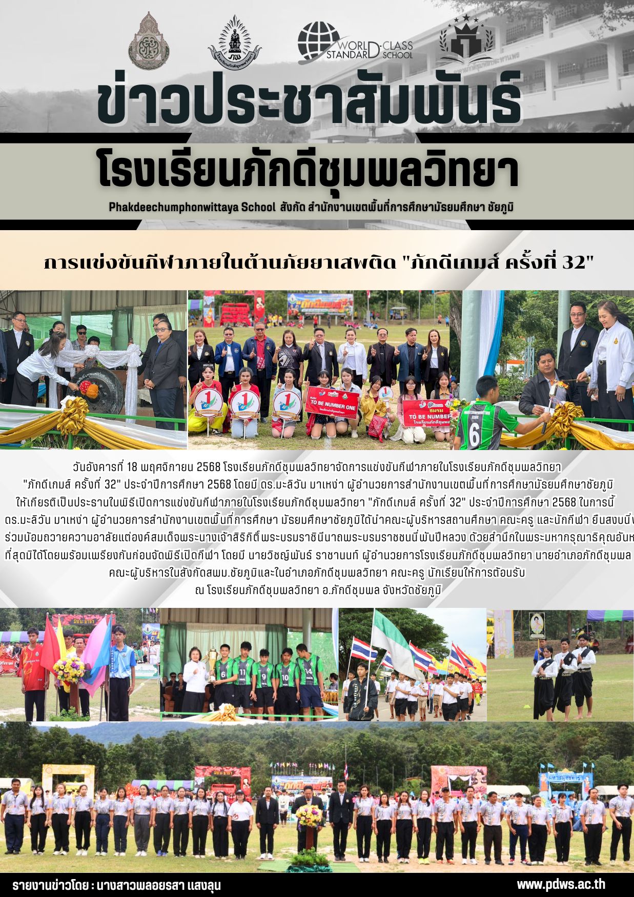 วันที่ 18 พฤศจิกายน 2568 โรงเรียนภักดีชุมพลวิทยา จัดการแข่งขันกีฬาภายในต้านภัยยาเสพติด "ภักดีเกมส์ ครั้งที่ 32"