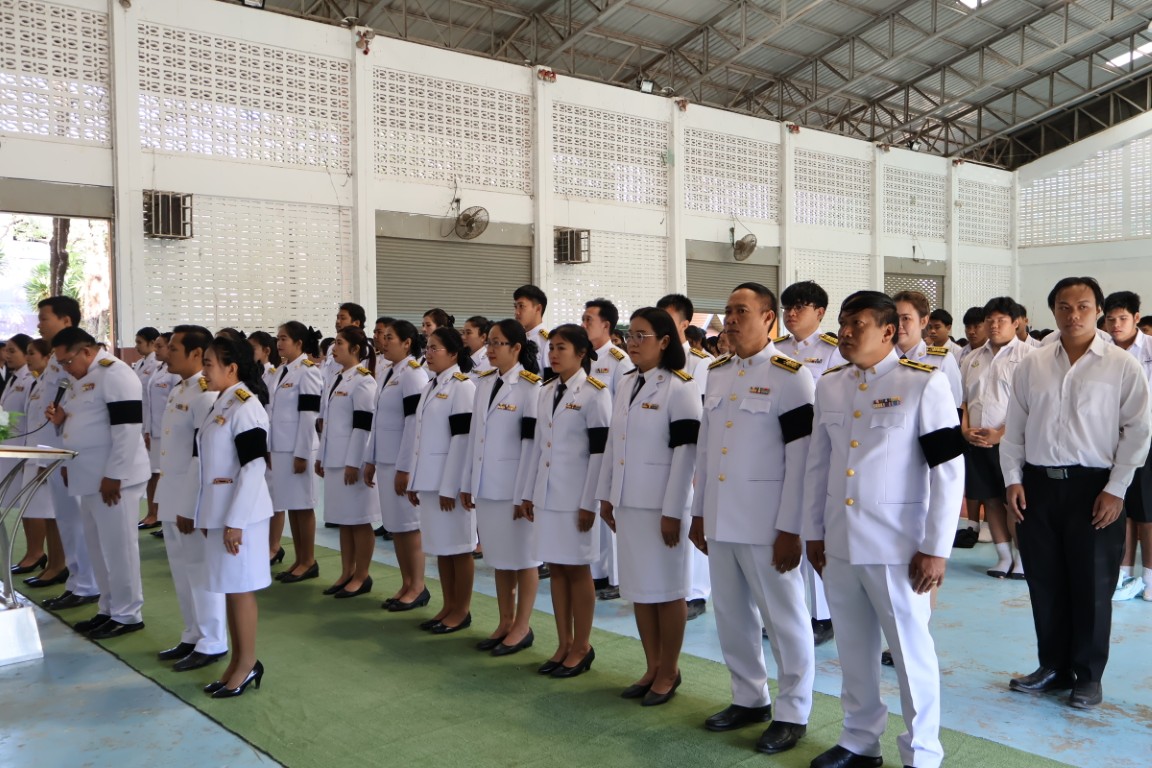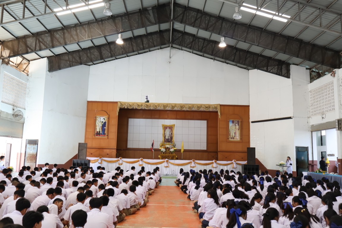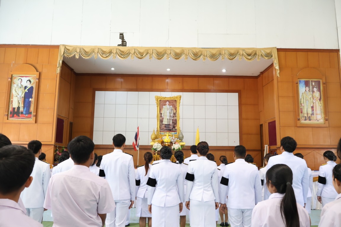 หน้าพระบรมฉายาลักษณ์ พร้อมกล่าวน้อมลำรึกในพระมทากรุณาธิคุณณ หอประชุม๙ปี โรงเรียนภักดีชุมพลวิทยา