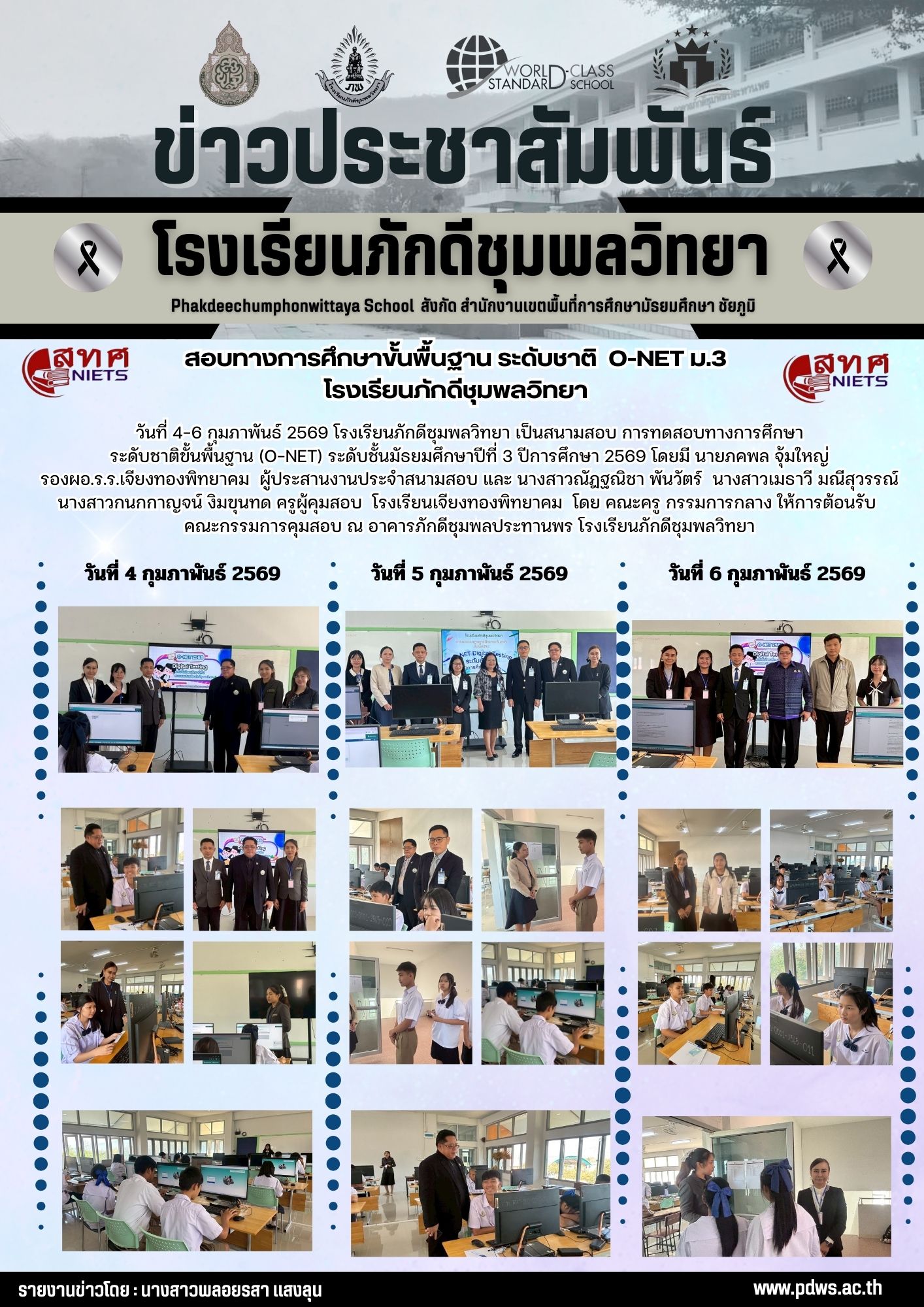 วันที่ 4-6 กุมภาพันธ์ 2569 โรงเรียนภักดีชุมพลวิทยา เป็นสนามสอบ การทดสอบทางการศึกษา