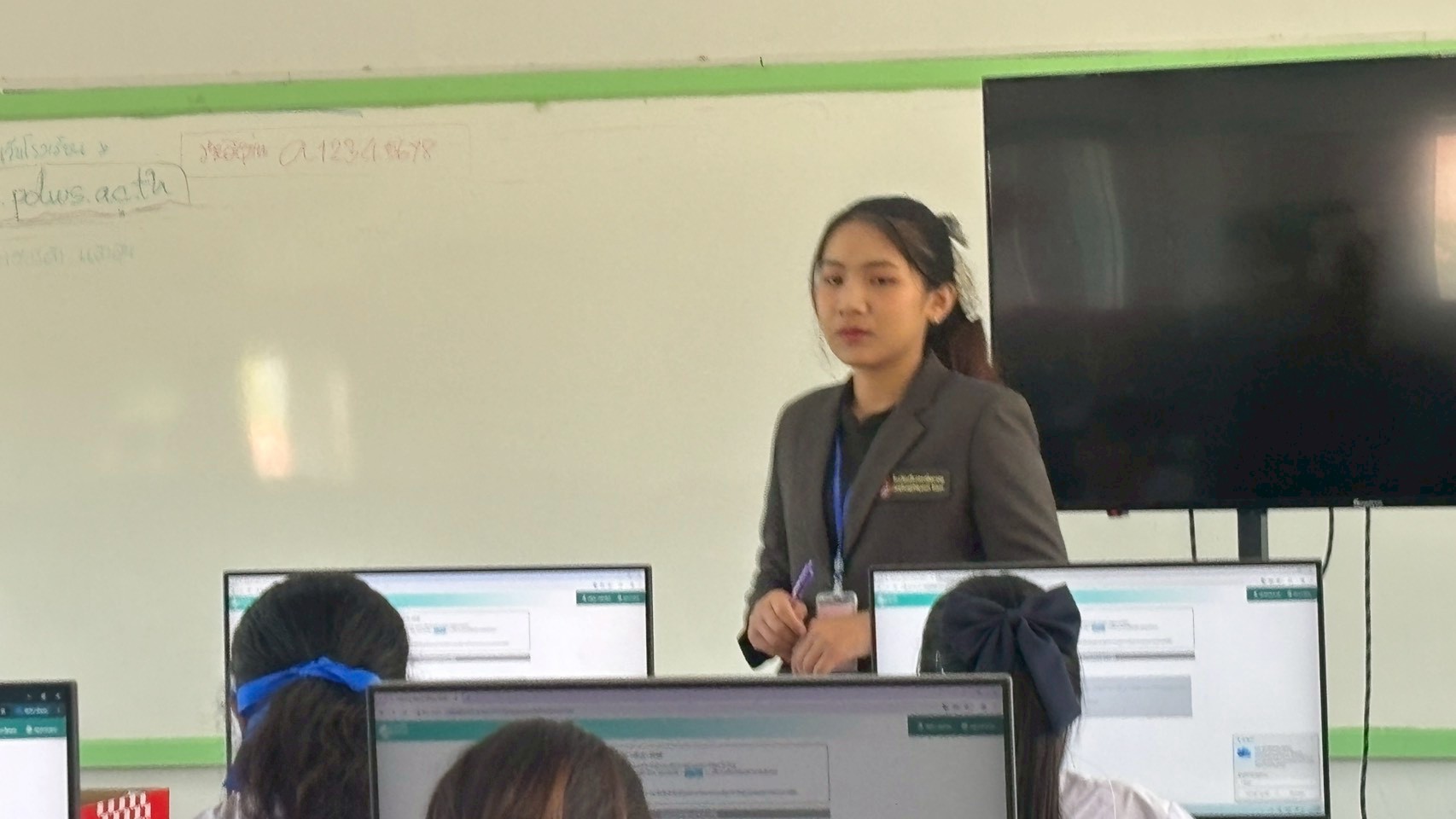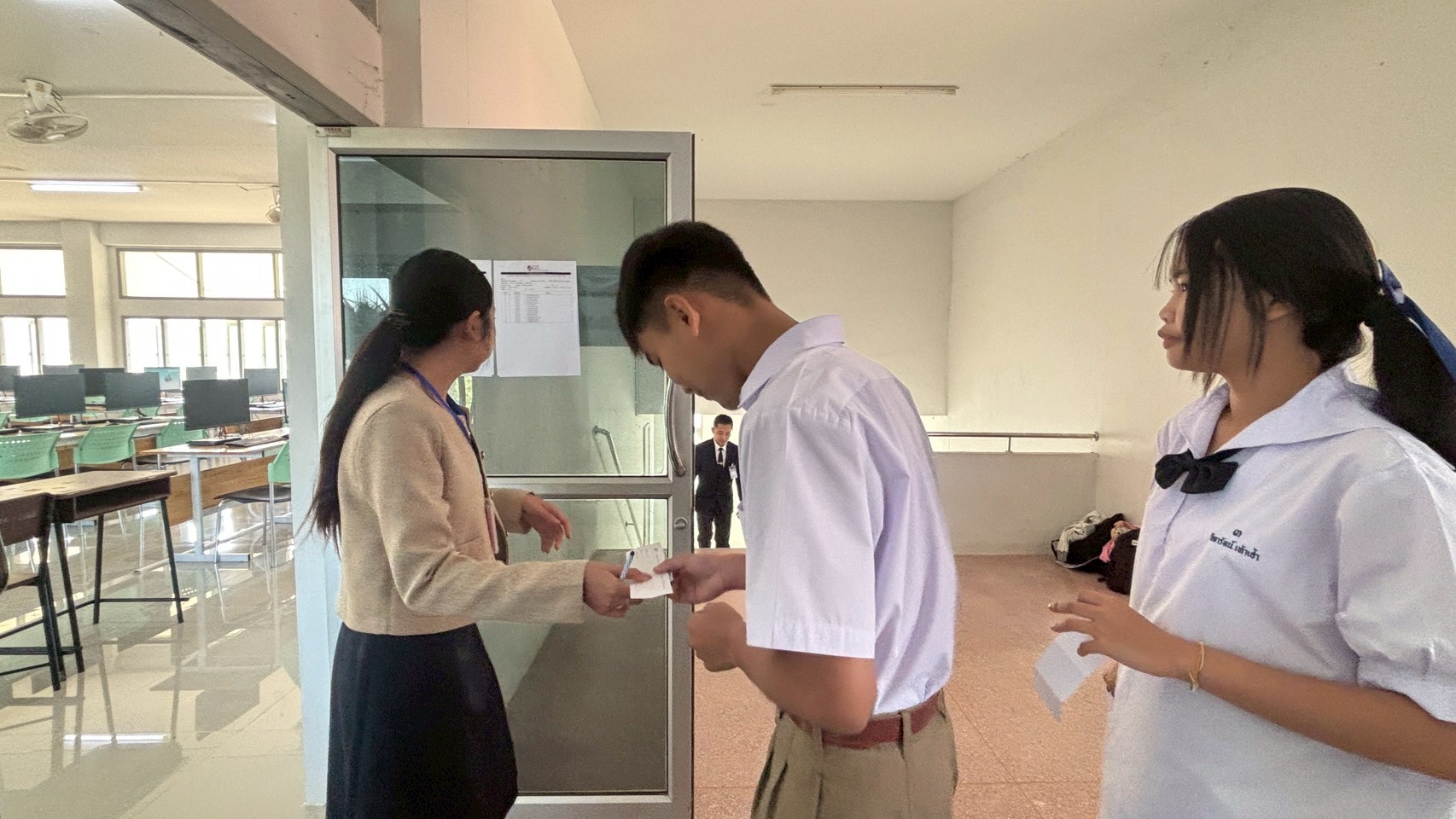 รองผอ.ร.ร.เจียงทองพิทยาคม ผู้ประสานงานประจำสนามสอบ และ นางสาวณัฎฐณิชา พันวัตร์ นางสาวเมธาวี มณีสุวรรณ์ นางสาวกนกกาญจน์ งิมขุนทด ครูผู้คุมสอบ โรงเรียนเจียงทองพิทยาคม โดย คณะครู กรรมการกลาง ให้การต้อนรับ