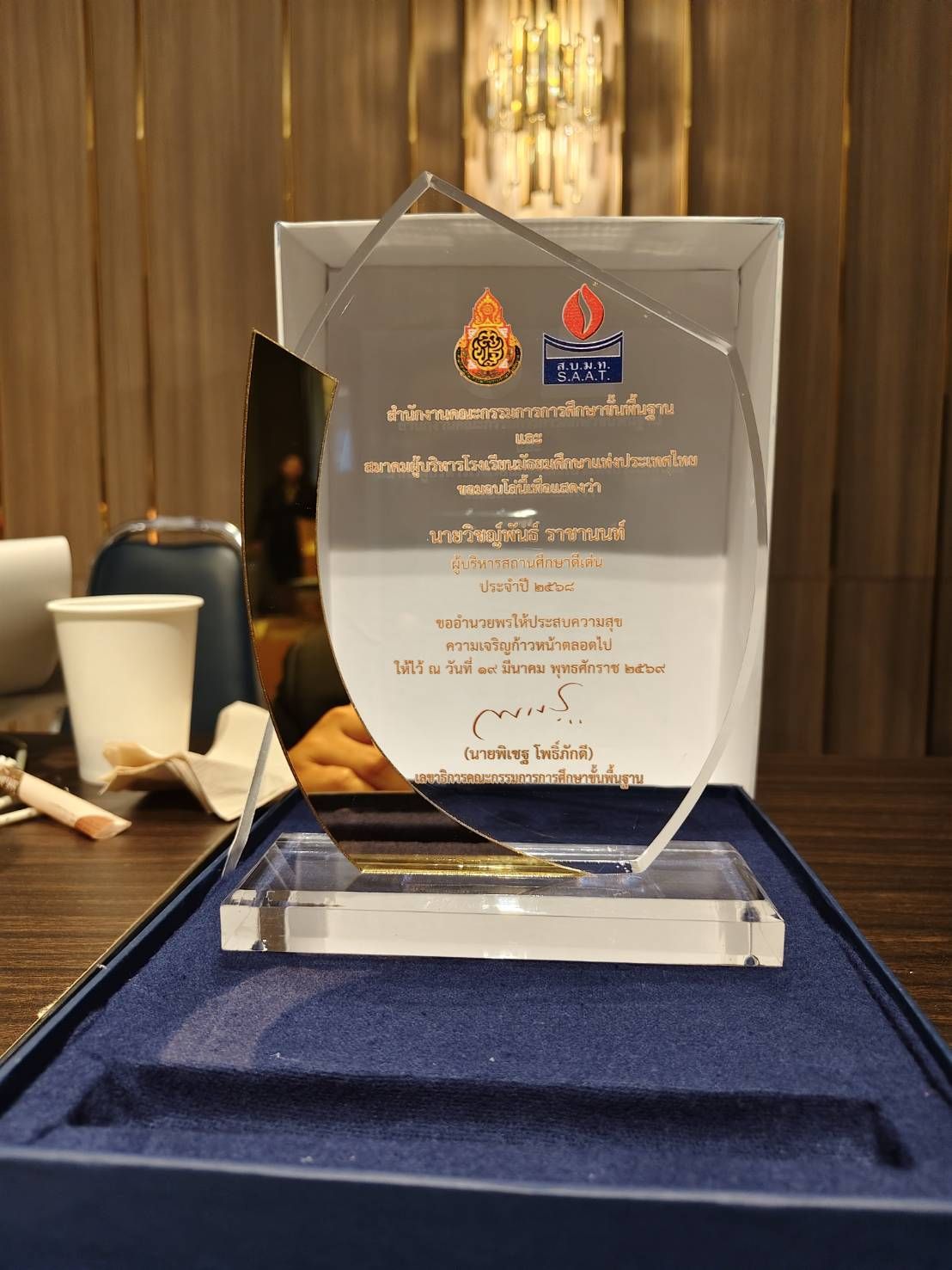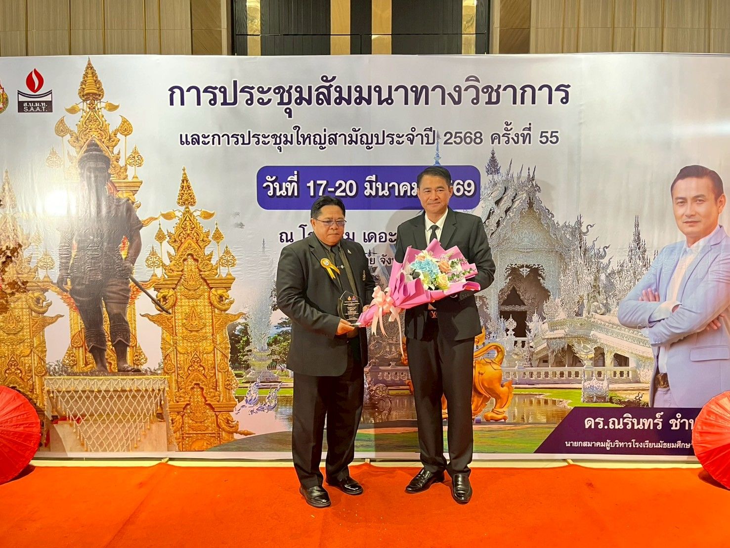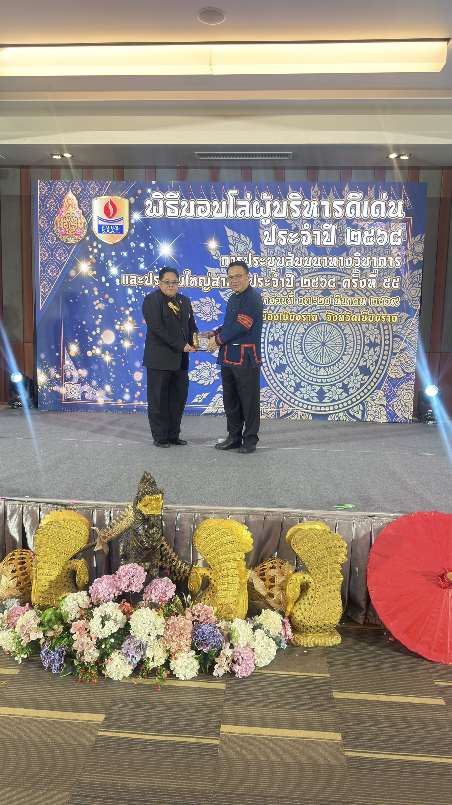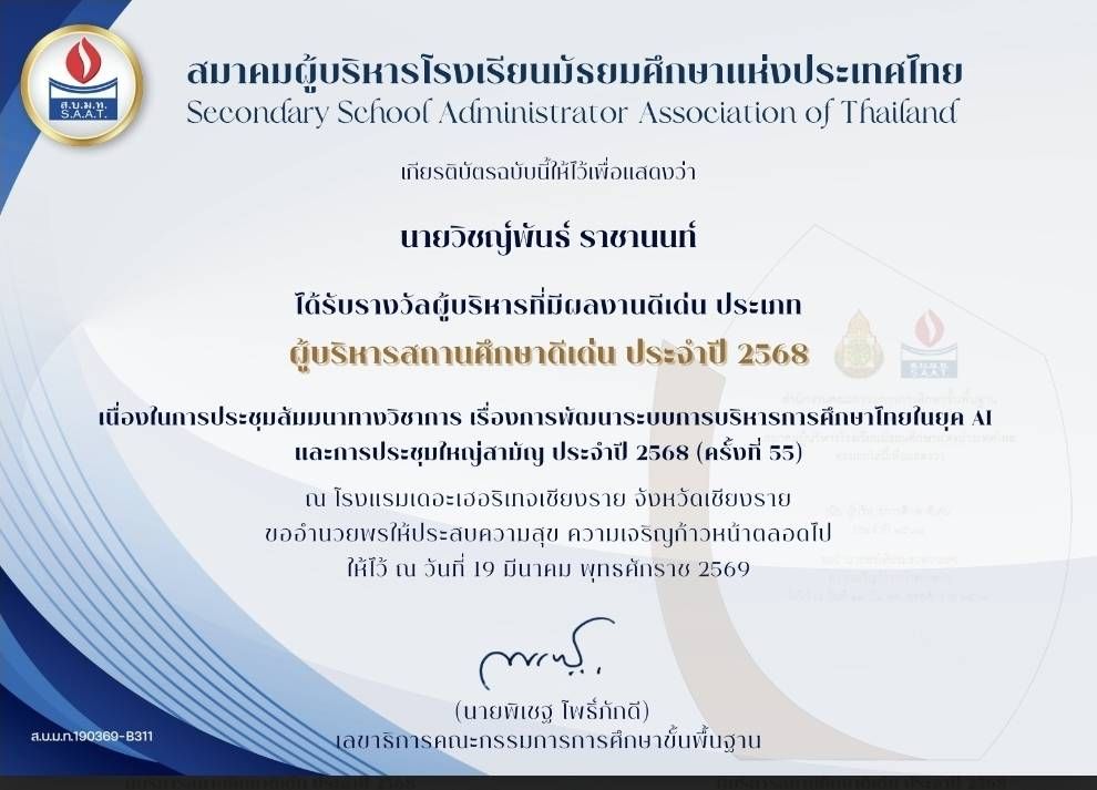 วันนี้ 19 มีนาคม 2569 เวลา 13.30 น. นายวิชญ์พันธ์ ราชานนท์ เข้ารับรางวัลผู้บริหารการศึกษาผู้ทำคุณประโยชน์ต่อการมัธยมศึกษาไทย  ในโอกาสรับโล่รางวัลผู้บริหารที่มีผลงานดีเด่น ประจำปี 2568   เนื่องในงานประชุมสัมนาวิชาการและการประชุมใหญ่สามัญ ครั้งที่ 55 ระหว่างวันที่ 17-20 มีนาคม 2569 ณ โรงแรมเดอะเฮอริเทจ จ. เชียงราย